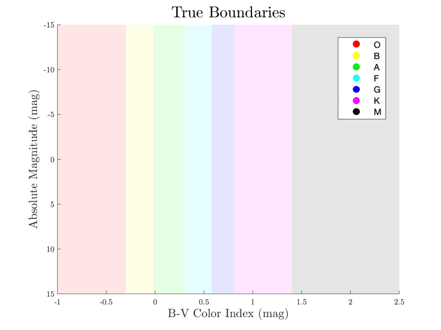 It should be noted that due to a combination of measurement errors and physical variation, these spectral classifications do not perfectly align with the neat vertical classification regions in the earlier figure. However, they still largely fit the pattern of vertical columns determined by B-V index, so an effective neural network can still be constructed provided the prediction question can be posed quantitatively.