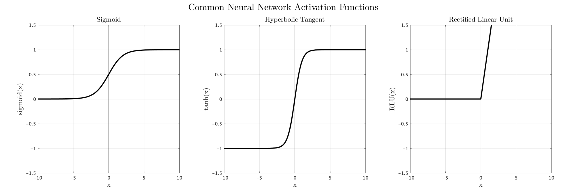 Once this weighted sum is calculated, it is passed through a nonlinear function called an activation function. This allows the network to model more complex situations where linear models don’t necessarily apply. In theory, any nonlinear function can be used to this effect, though in reality only a handful are commonly used. Examples of common activation functions include the sigmoid, hyperbolic tangent, and rectified linear functions.