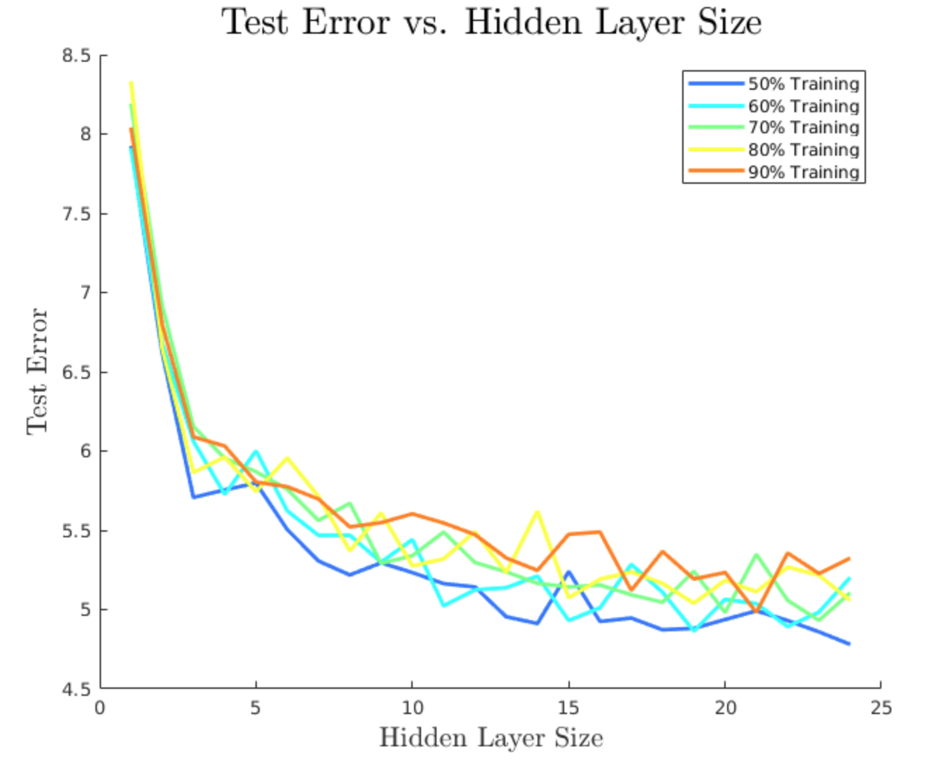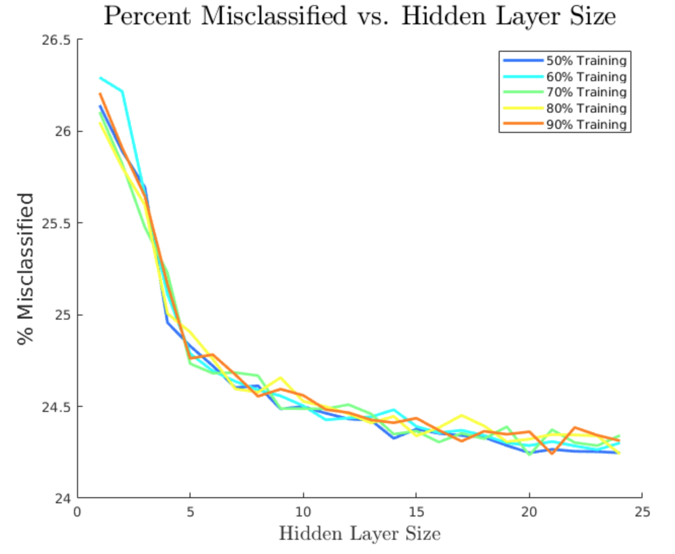 I tried every hidden layer size from 1 to 24 neurons, and training percentages of 50, 60, 70, 80, and 90%. For each of these hyperparameter combinations, I averaged results over 10 runs. This is because the random initialization of neural networks means that performance of a particular network may be significantly influenced by chance. Statistical results, such as the central limit theorem, tell us that this variability can be reduced by averaging over multiple runs. In total, it took my i7 quad-core laptop about 10 hours to train and test all of these networks, giving some fascinating trends in the results.