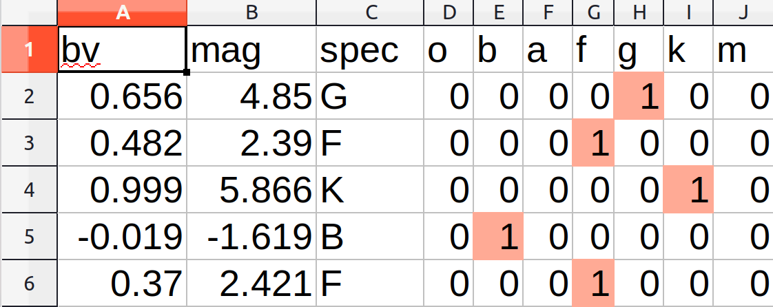 In order to translate spectral type into a form that a neural network can understand, we created a set of seven “dummy variables.” Dummy variables are a set of binary variables, each of which corresponds to a different class type, in this case one each for O, B, A, F, G, K, and M. For each star, its corresponding class is marked with a 1 and the rest are set to 0. This allows a categorical variable to be transformed into a set of quantitative variables, which can then be processed by a neural network.
