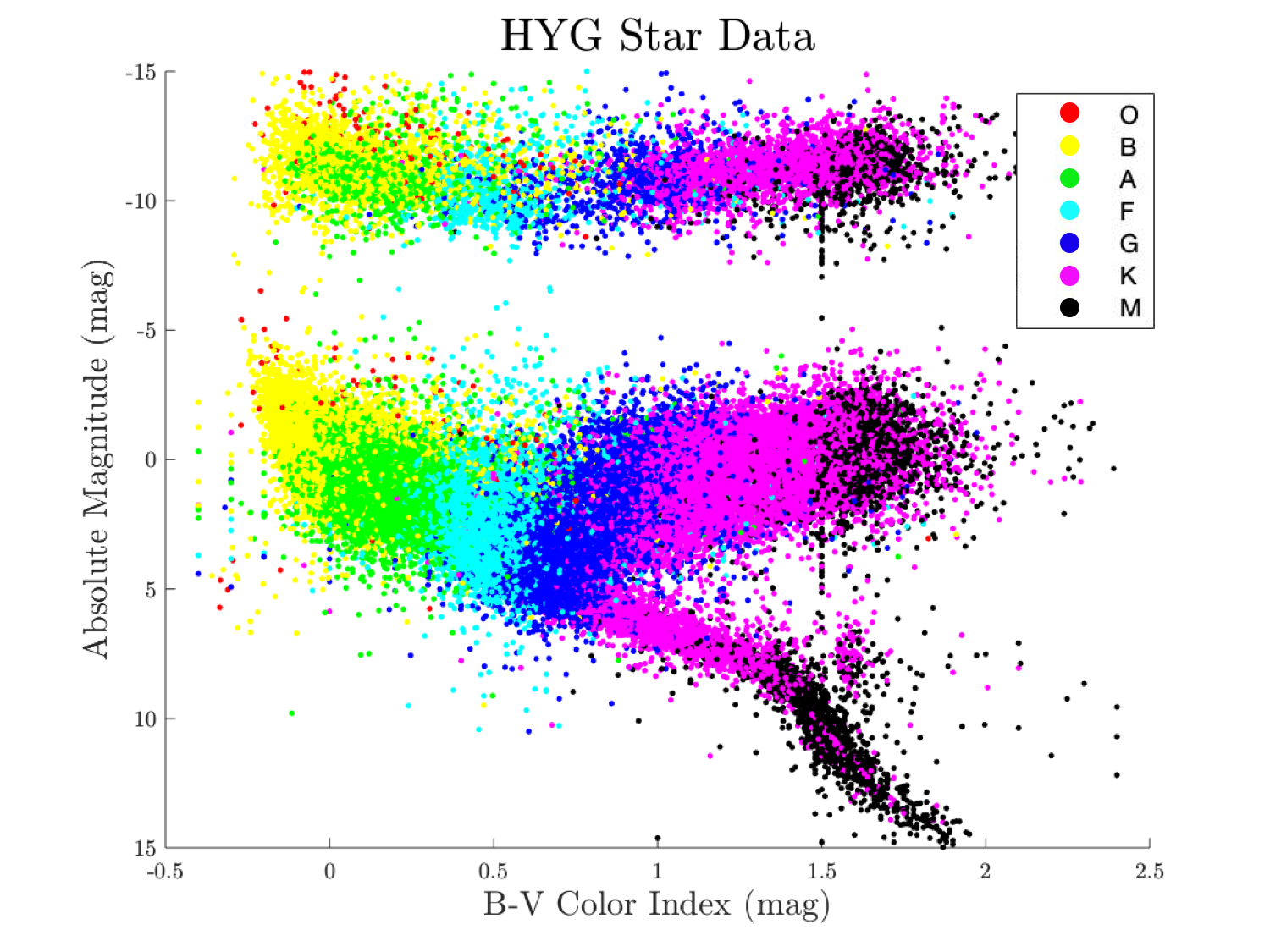 The Hertzsprung-Russel diagram–also known as the HR diagram–is a handy tool to help cluster similar types of stars. The x-axis sorts by a stellar feature called the B-V color index, which is directly related to surface temperature. The y-axis corresponds to a star’s absolute magnitude, which is similar to brightness; more negative numbers correspond to greater brightness. Based on a star’s position in this feature space, it is classified as a certain “spectral type,” ranging from O to M for most common stars.