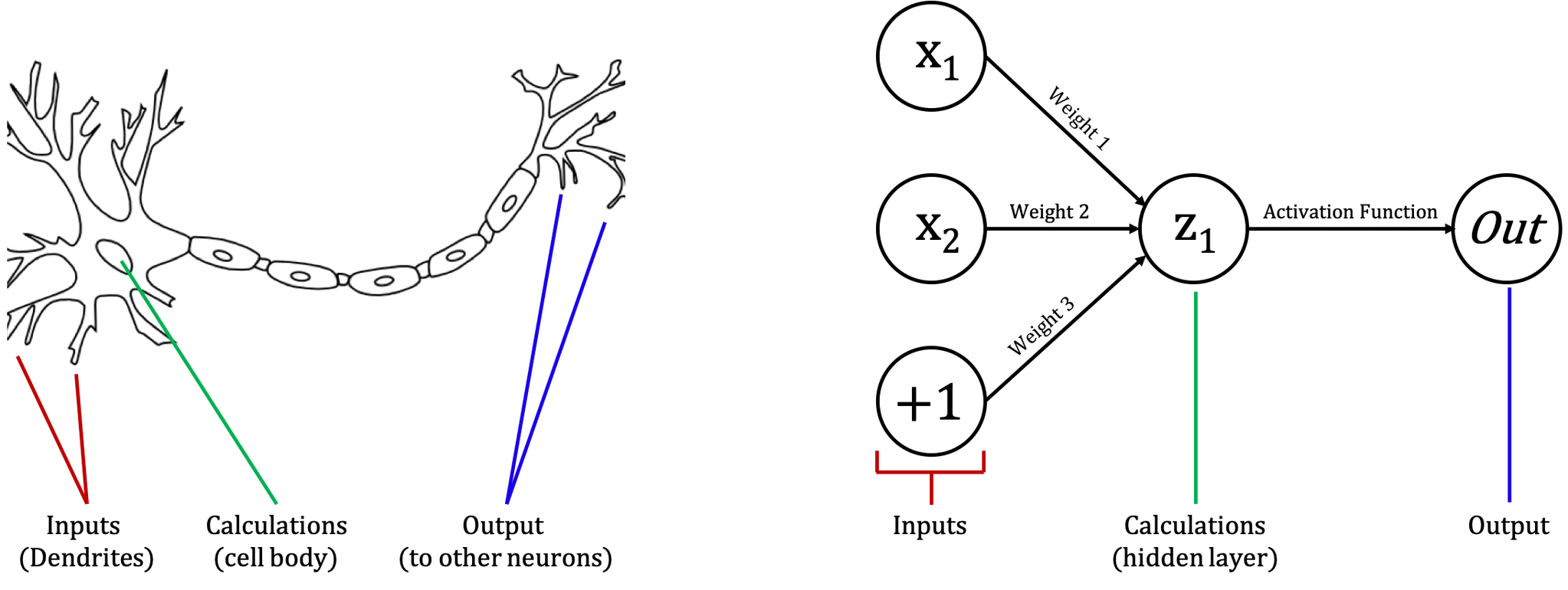 A neuron and its analogies to a simple neural network with inputs, calculations, and outputs; neuron image from Virtual Amrita Laboratories
